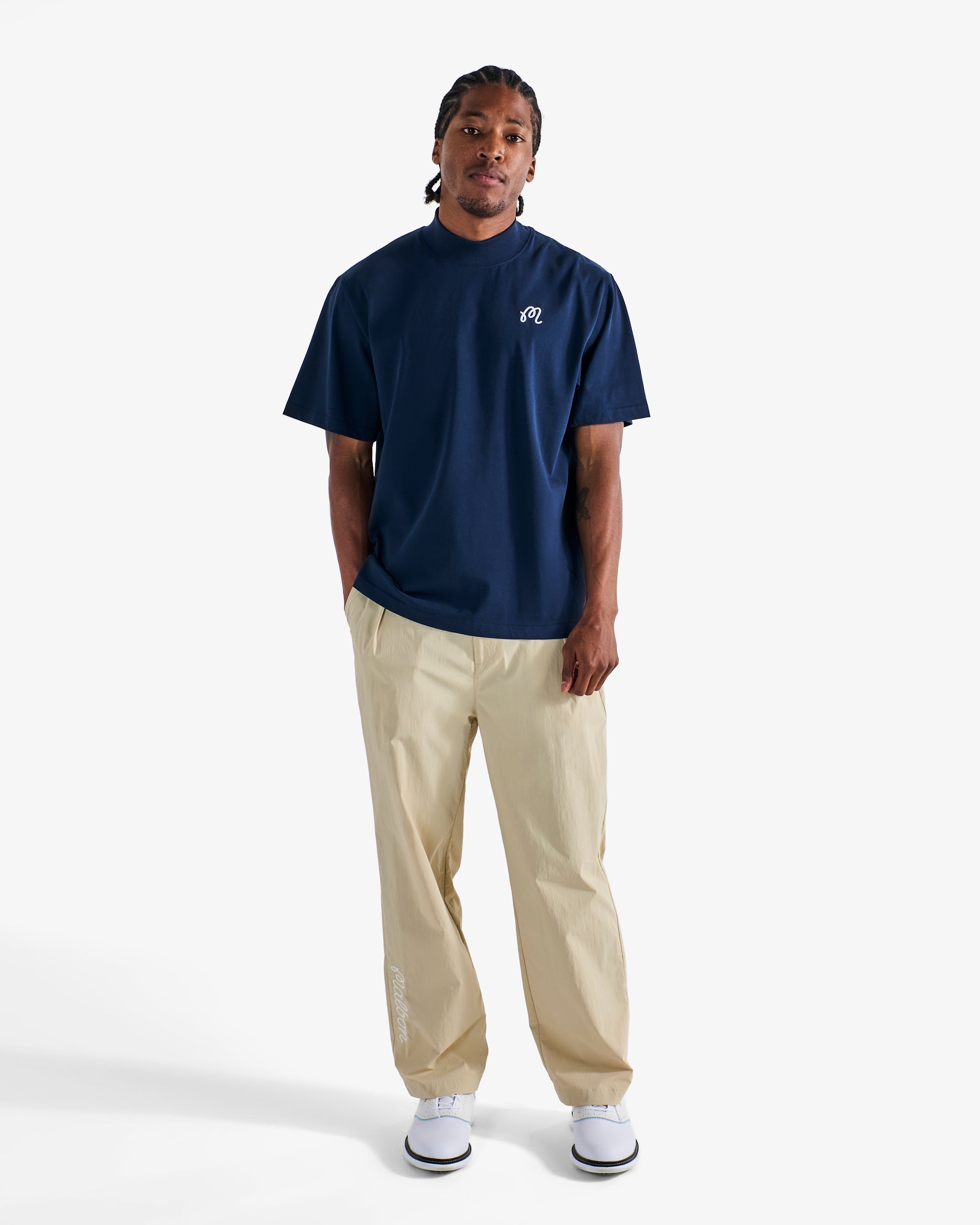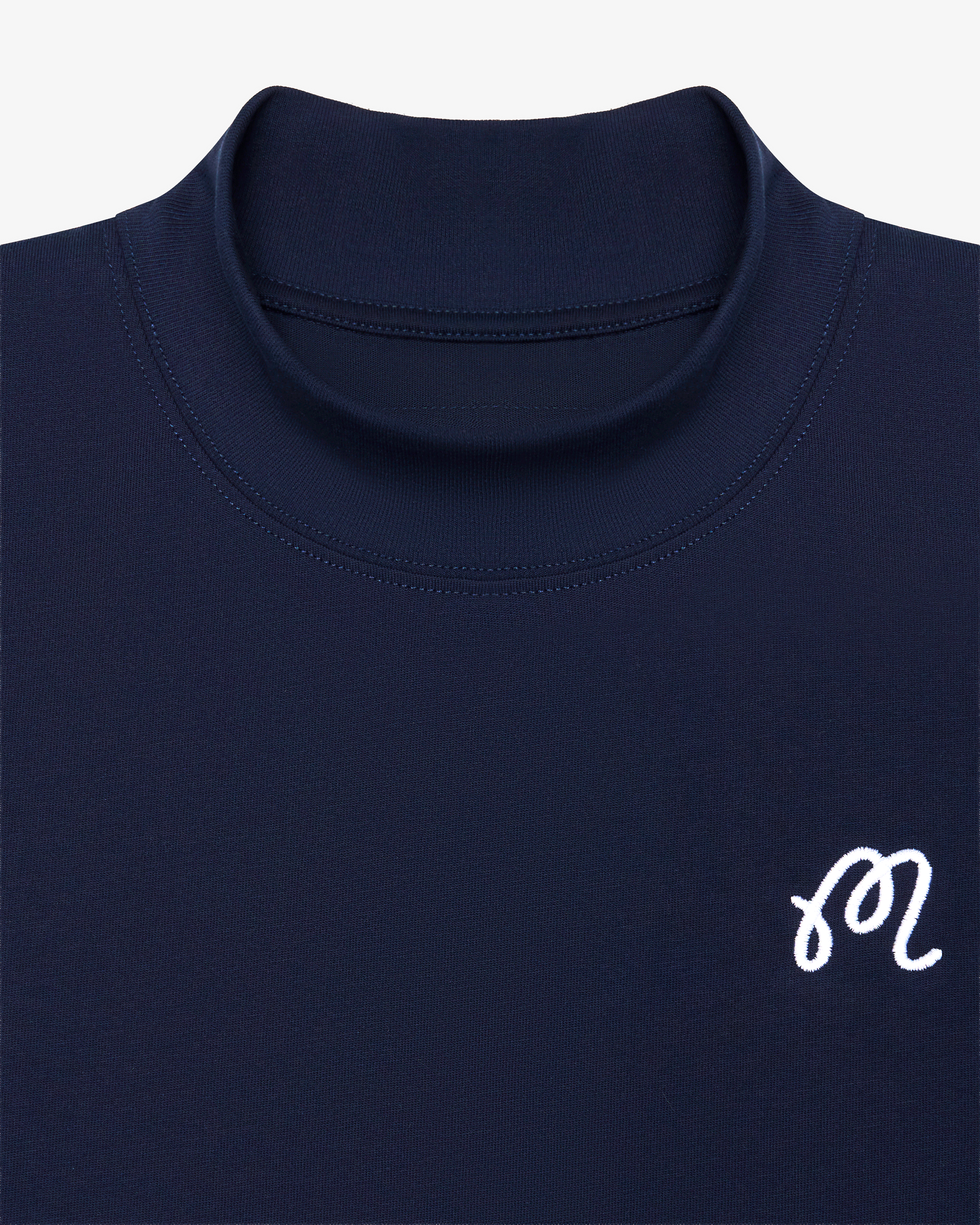 - Embroidered M script logo on left chest