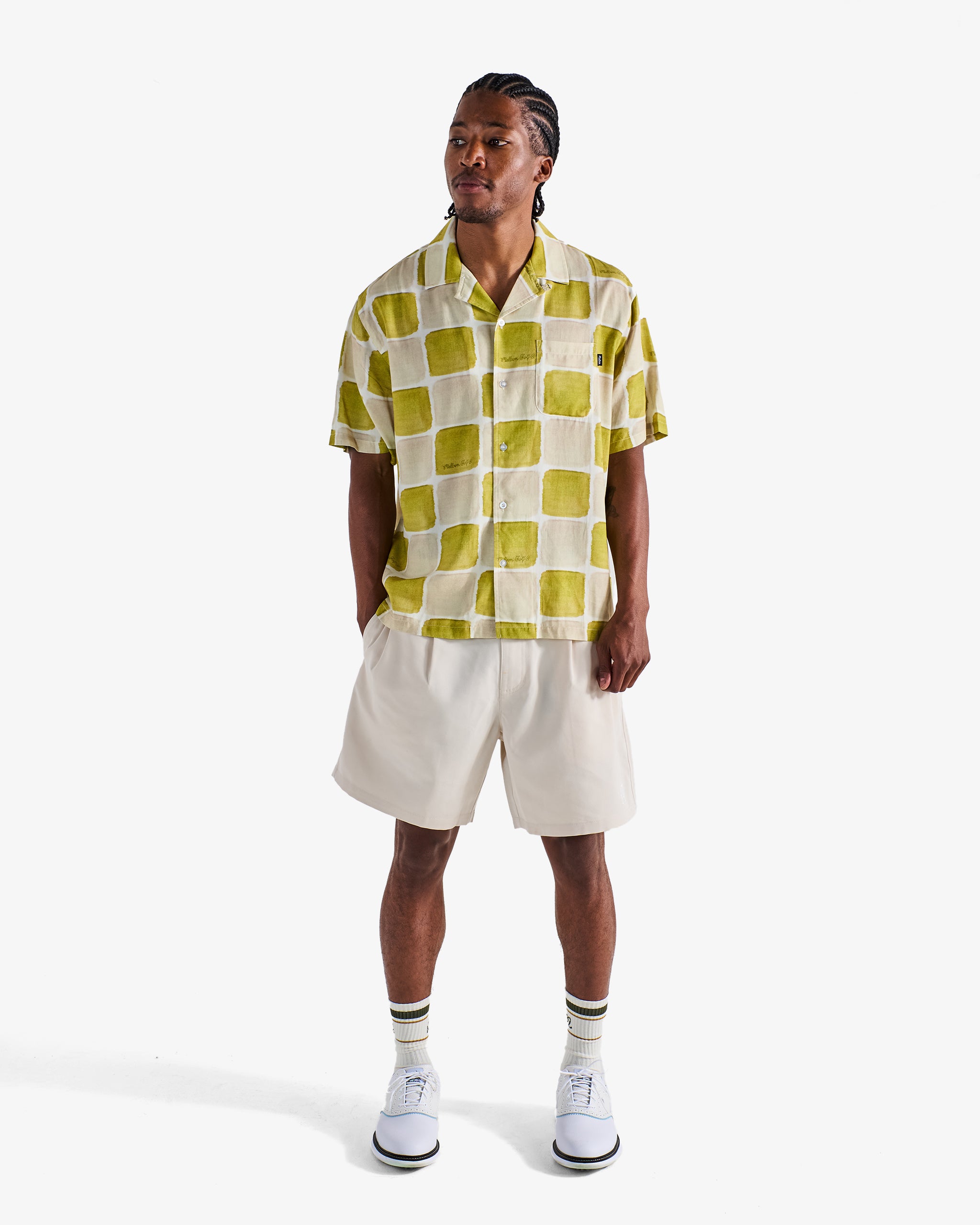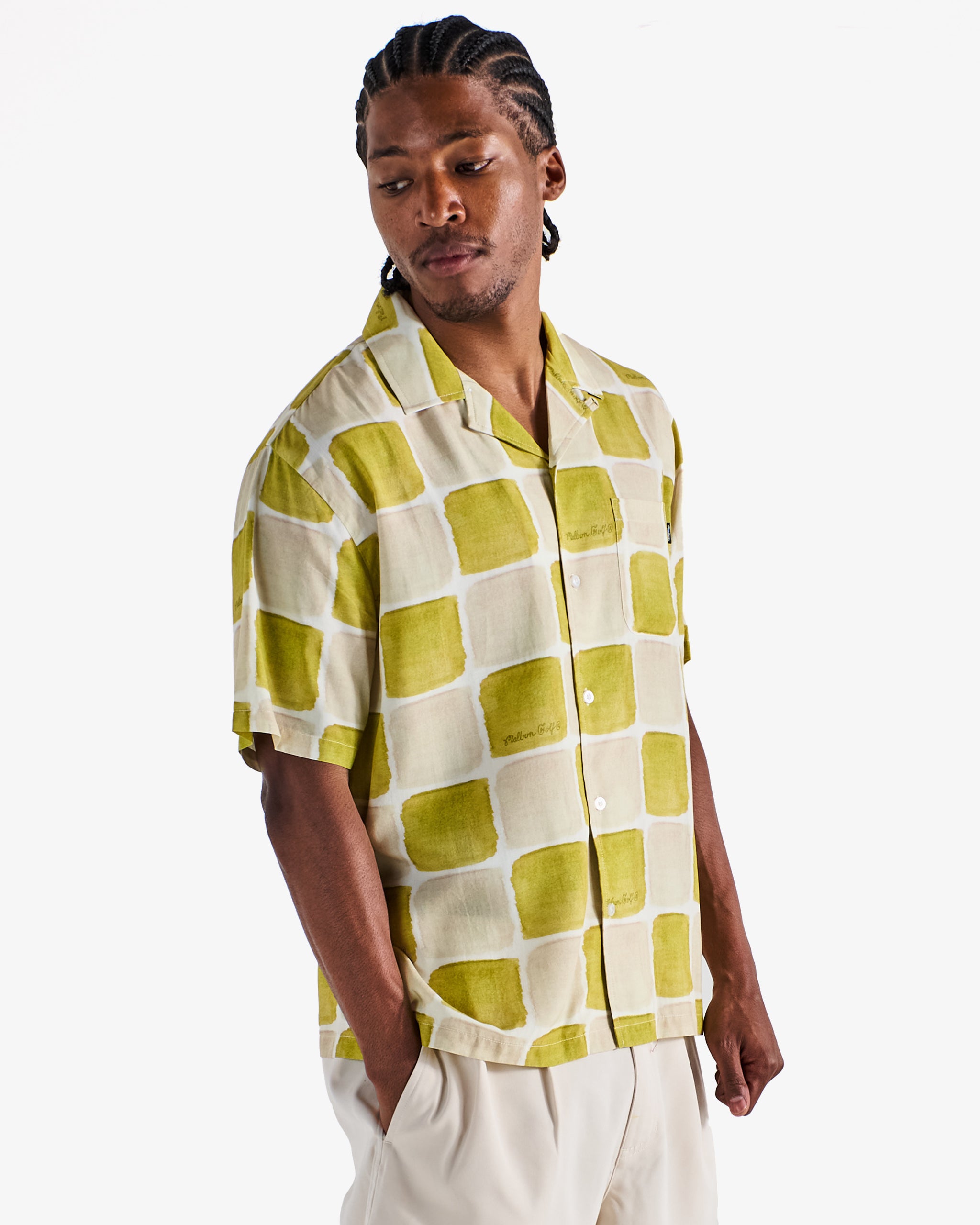 Printed throughout in a bold graphic. our Piastrella Shirt reflects coastal ease with an open camp collar. branded transparent buttons. and a perfectly relaxed cut. The lightweight fabrication provides excellent breathability. making it ideal for warmer temperatures.
