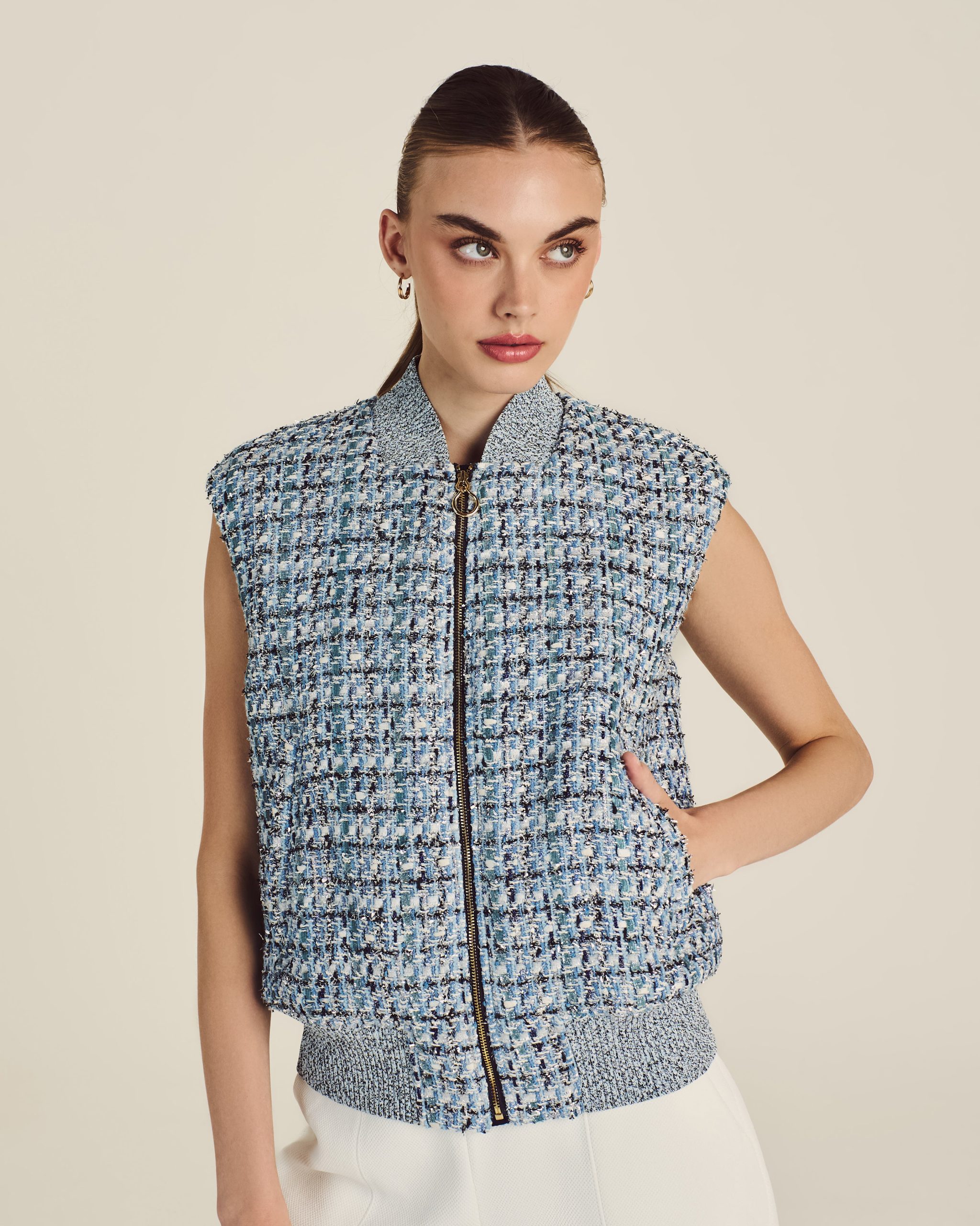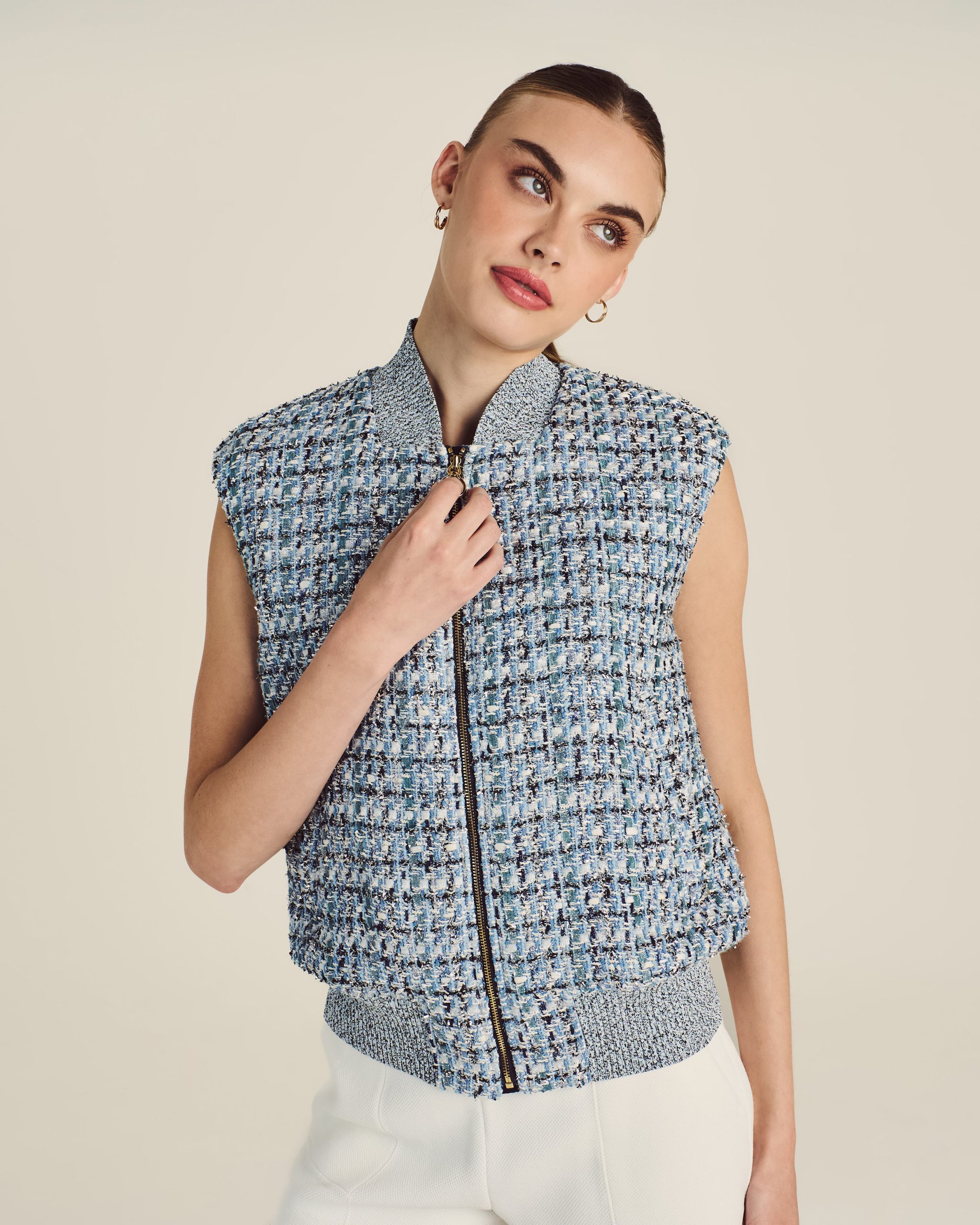 Created for the exclusive Malbon x St. John collaboration. this vest is a glamorous and grown-up take on athleisure. Crafted in the brand’s signature tweed and finished with a gold zipper. this vest embodies St. John’s trademark style while the streamlined silhouette and ribbed neckline keeps it sporty enough to get you through your game??or your other off-duty plans??with effortless polish.