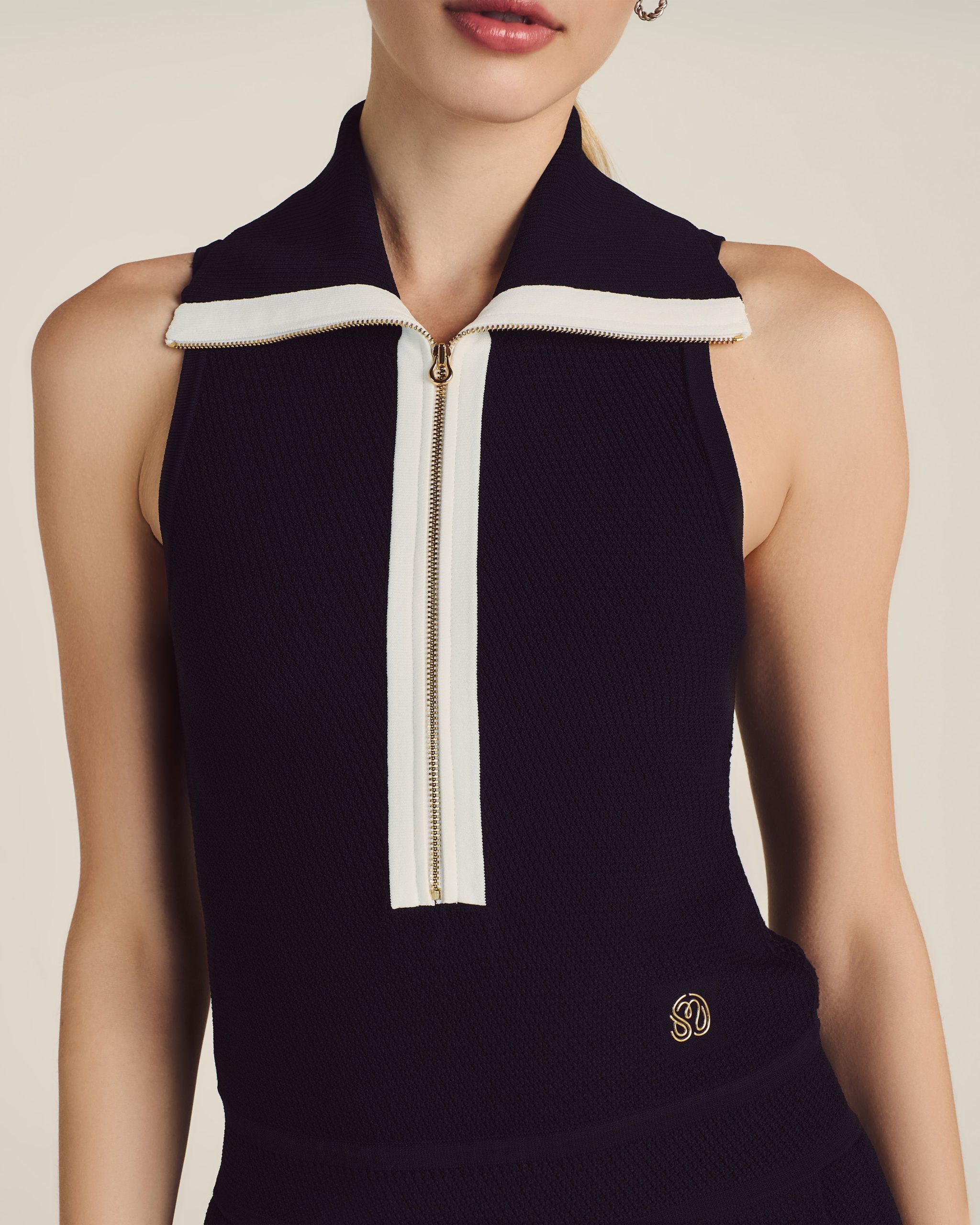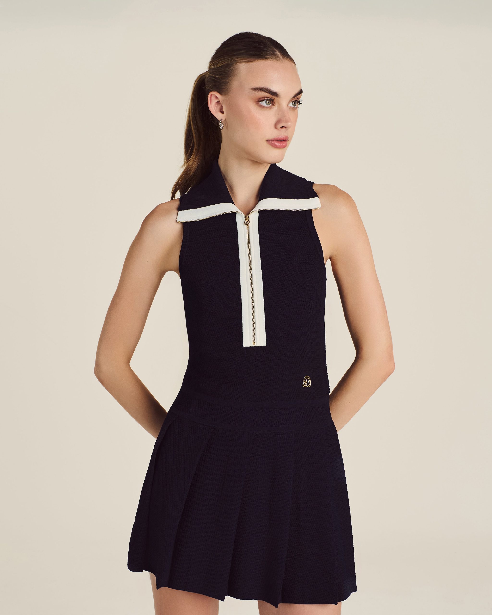 Created for the exclusive Malbon x St. John collaboration. this style is the epitome of sporty sophistication. Playful yet polished. this dress’s sleek. sleeveless silhouette and pleated skirt makes a statement whether or not you’re on the course. and the flexible Diagonal Stretch Knit offers a comfortable fit so you can move effortlessly through all your afternoon plans.
