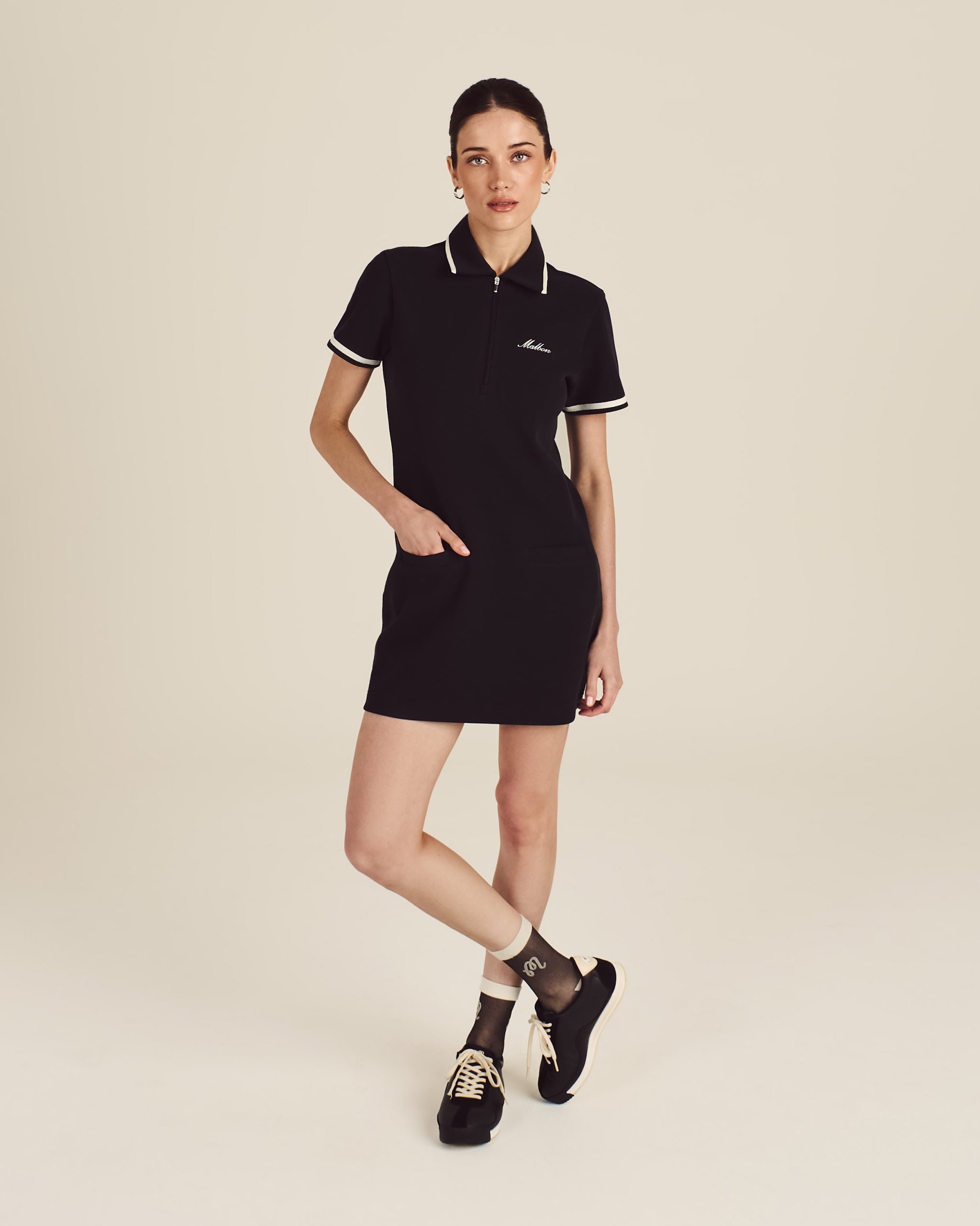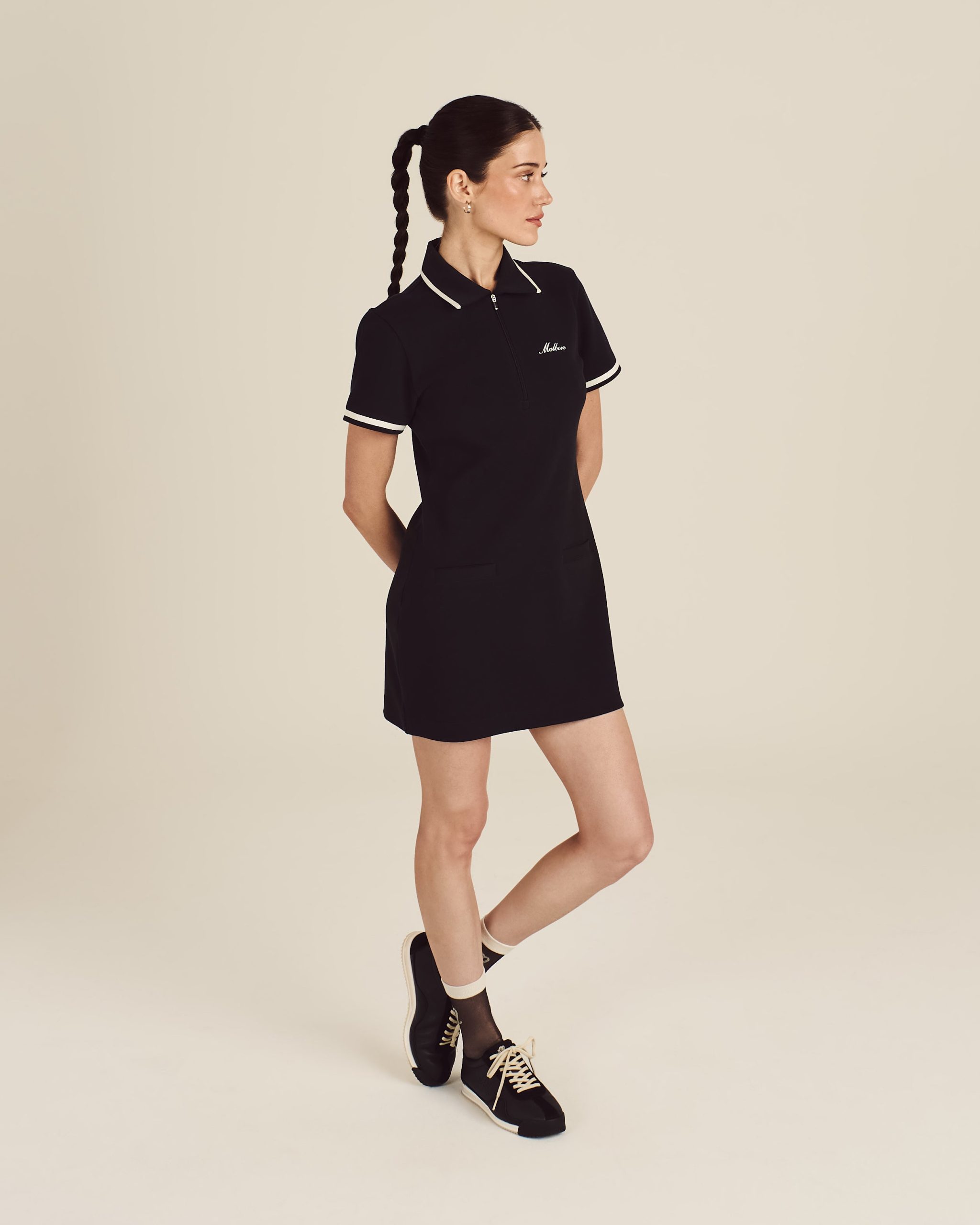 Made with a soft cotton-poly blend and finished with grosgrain ribbon trims. our Stella Dress is all about low-key polish. Front welt pockets add utility. while built-in interior shorts with a single pocket provide coverage. Any activity applies.