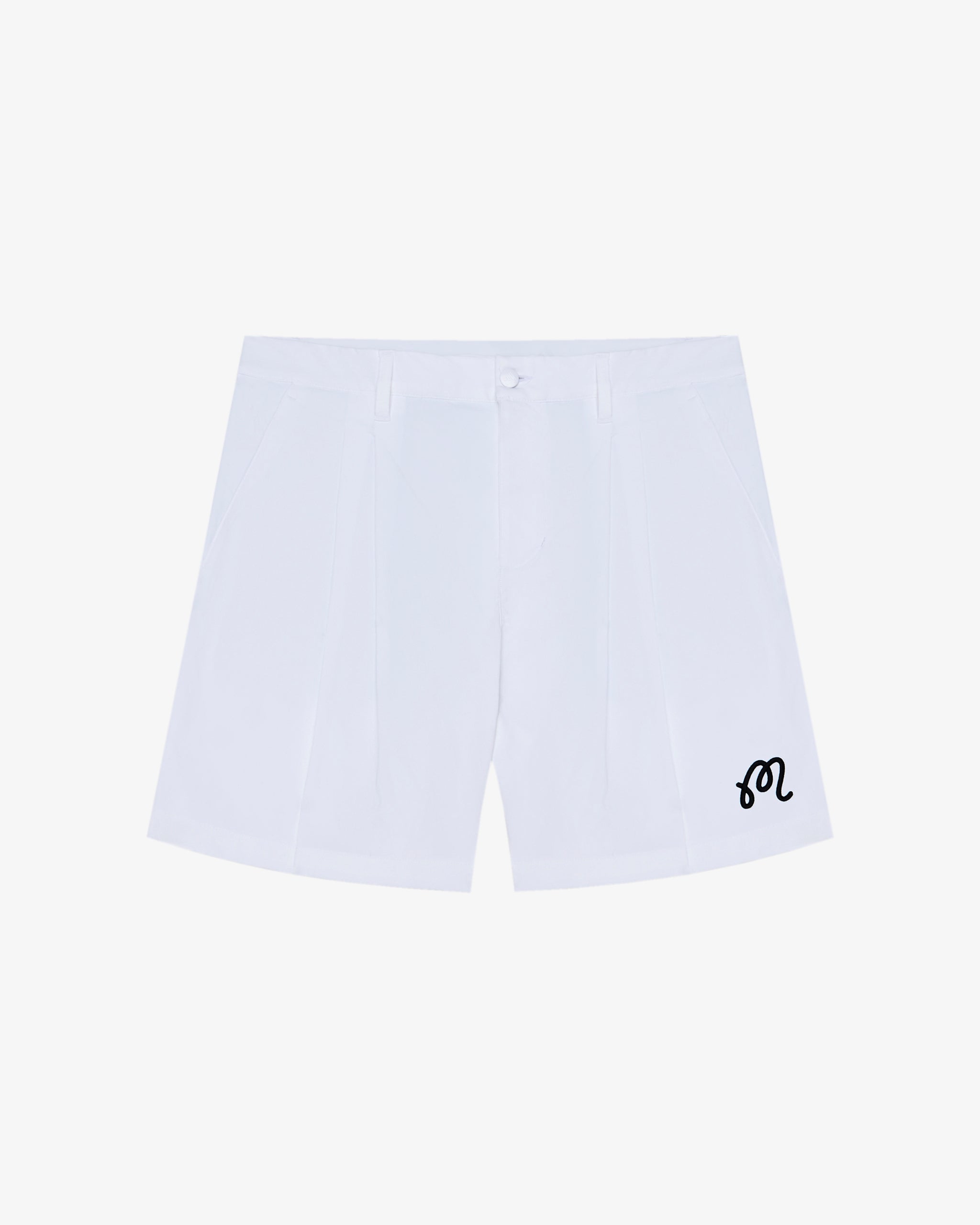 • Embroidered M script logo on left leg