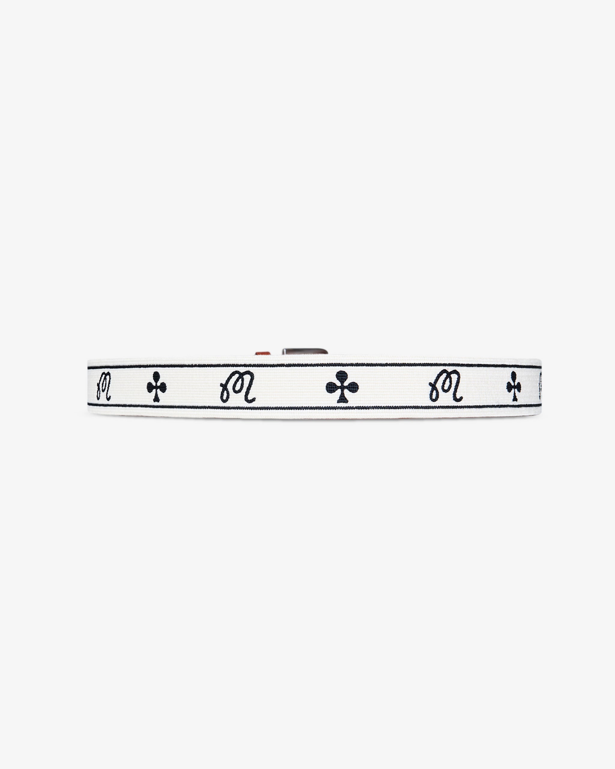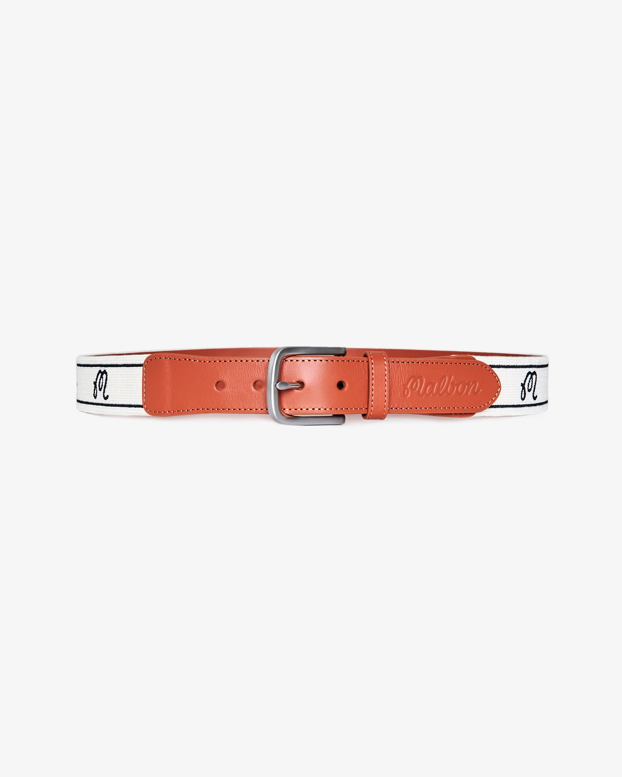 Crafted of woven canvas. the Alfred Belt balances a sleek leather buckle and timeless silver-tone closure with intricate jacquard artwork.