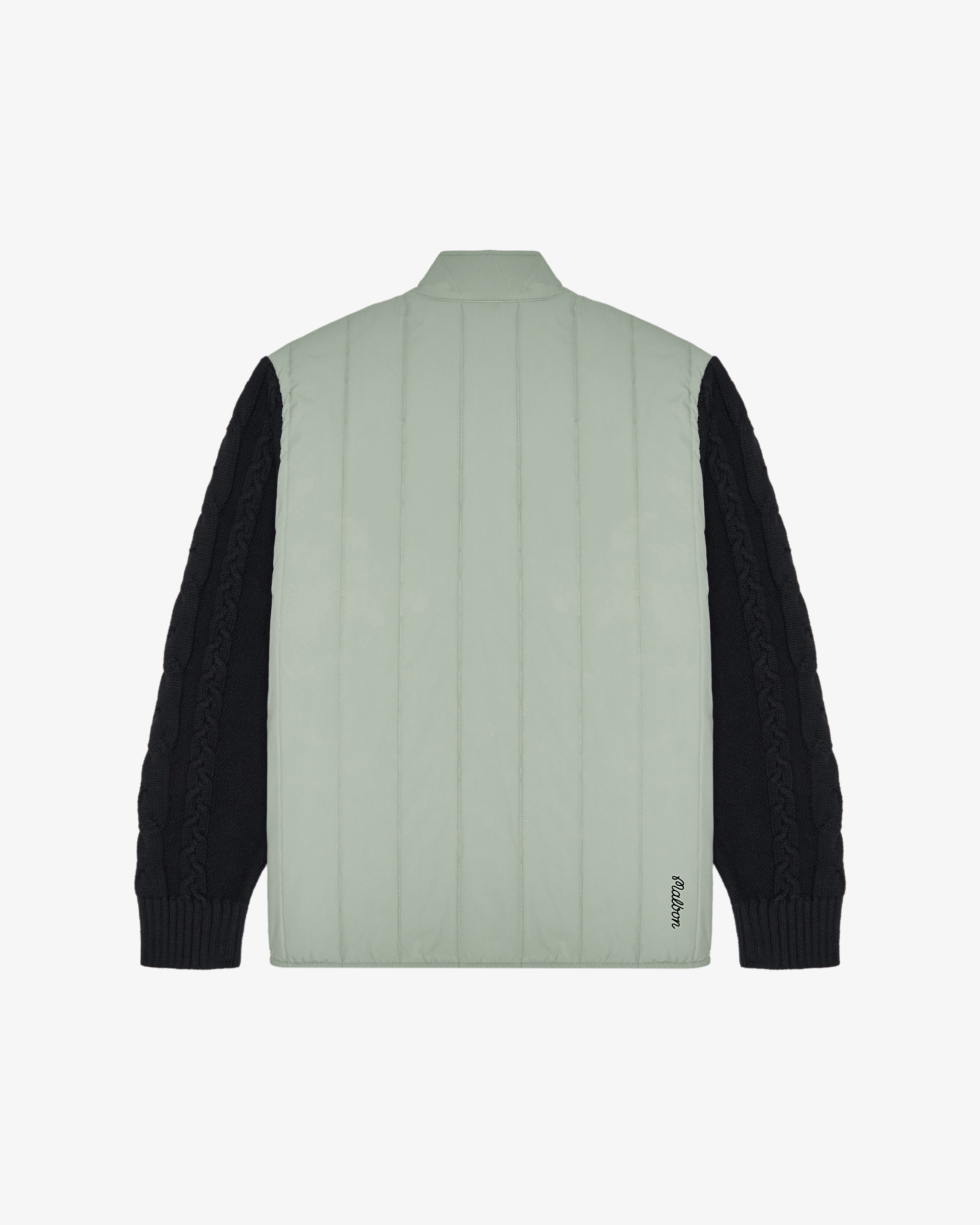 Our Isle Hybrid Jacket thoughtfully combines materials for versatile wear. Its protective polyester shell pairs with textured cable knit sleeves. creating a balanced approach to function and comfort. Cut with a relaxed fit and finished with ribbed cuffs and pockets. it’s a fine example of understated design.