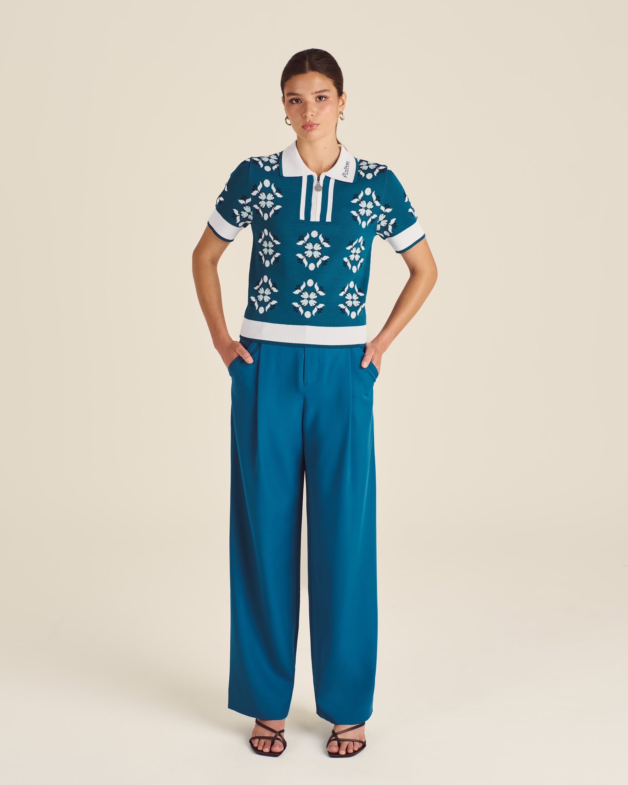 The Lucia Quarter Zip Polo is a standout piece on the course. Featuring an all-over pattern and ribbed trim. it ensures a comfortable fit while thoughtful details illustrate the quality craftsmanship.