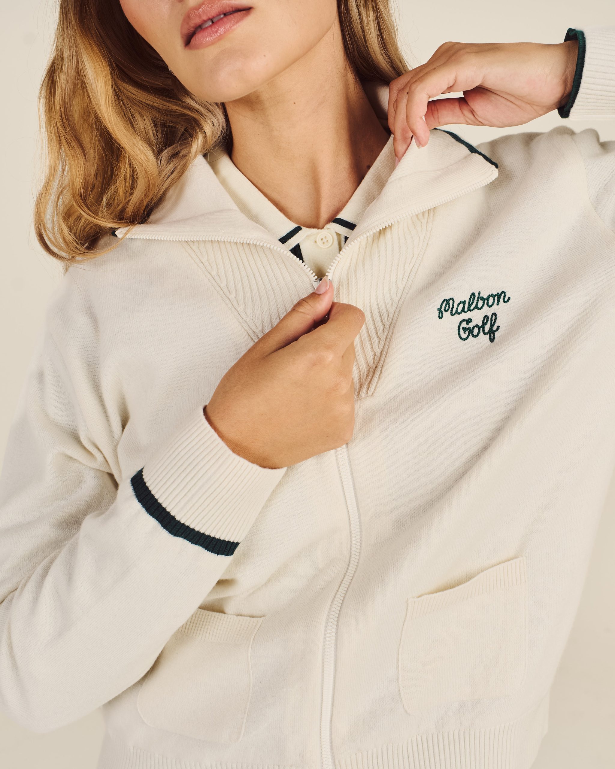 Made with soft wool yarn and featuring a windproof lining for extra warmth. our Preserve Buckets Knit Windbreaker highlights Malbon branding for a nice finish. perfect for everyday and rounds on the course.