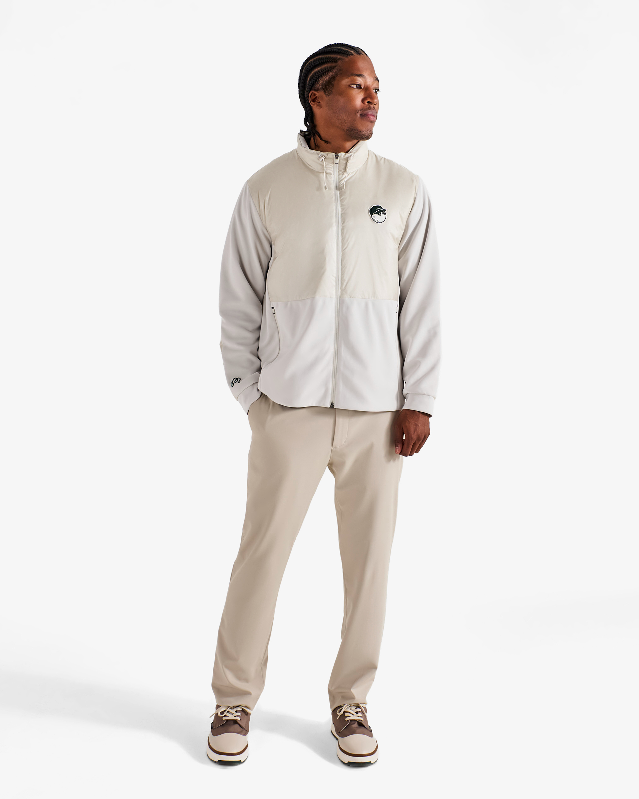 Combining stretch jersey fabric and lightweight down for exceptional warmth and mobility. our Preserve Hybrid Down Jacket is a versatile piece that functions as outerwear as well as a mid-layer. Goose down is applied to areas that need insulation. while stretch material is used in high-movement zones for unrestricted motion during swings.
