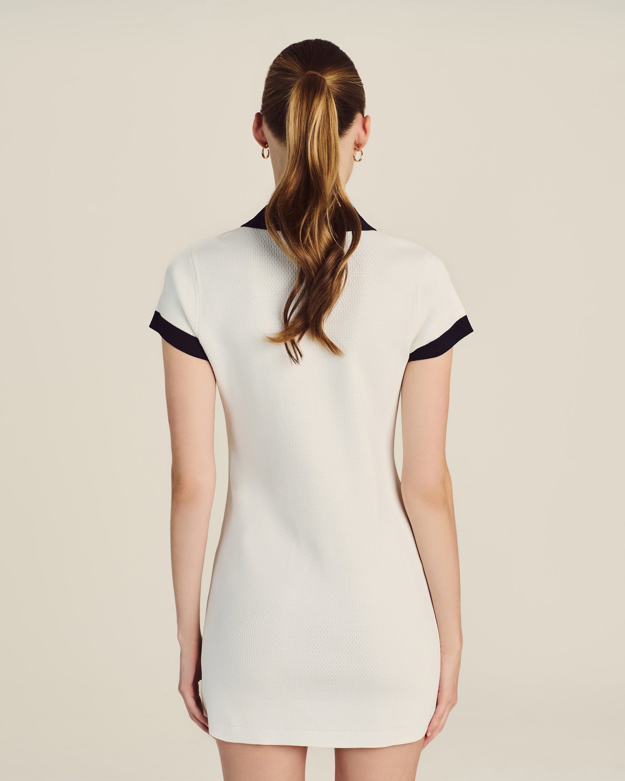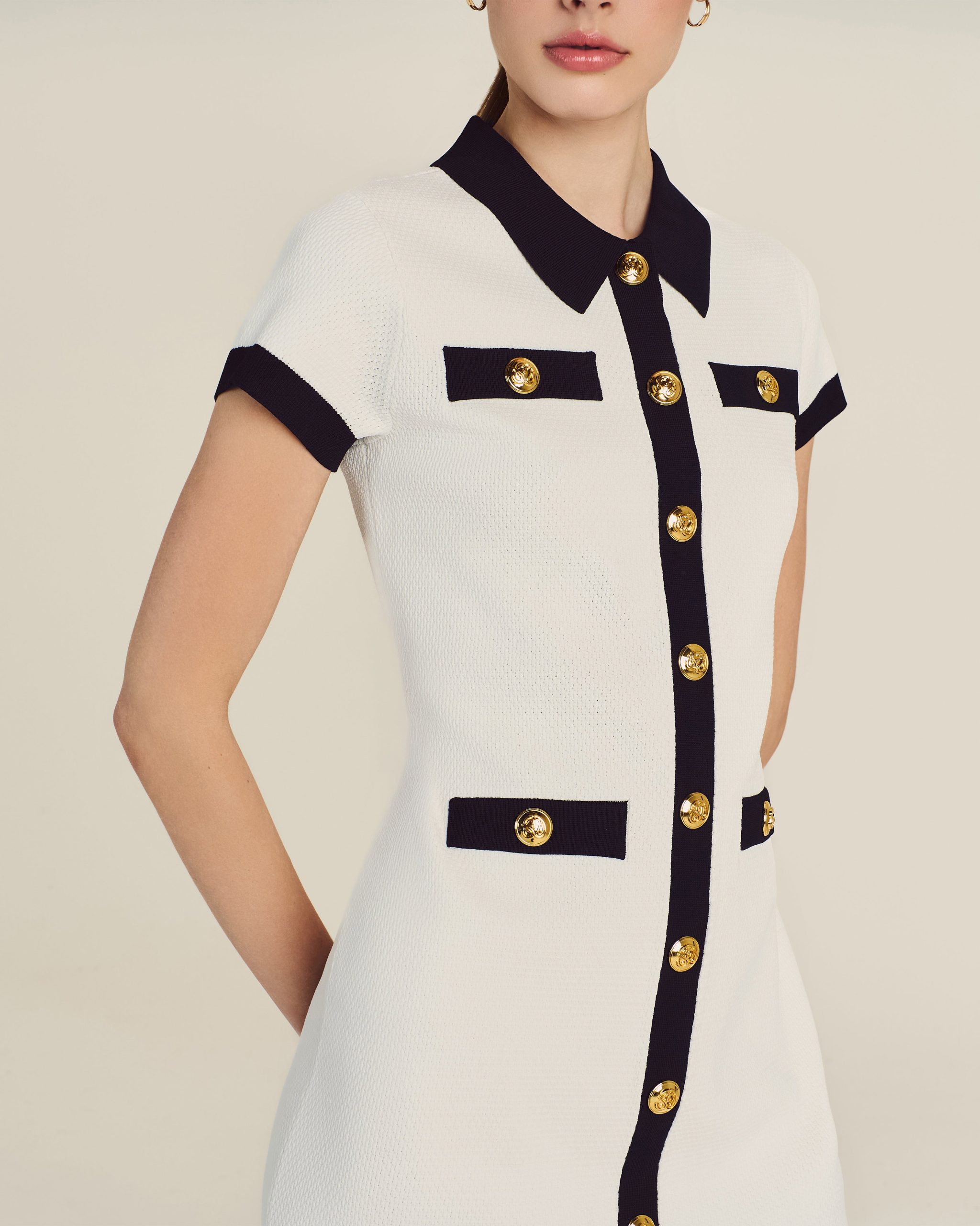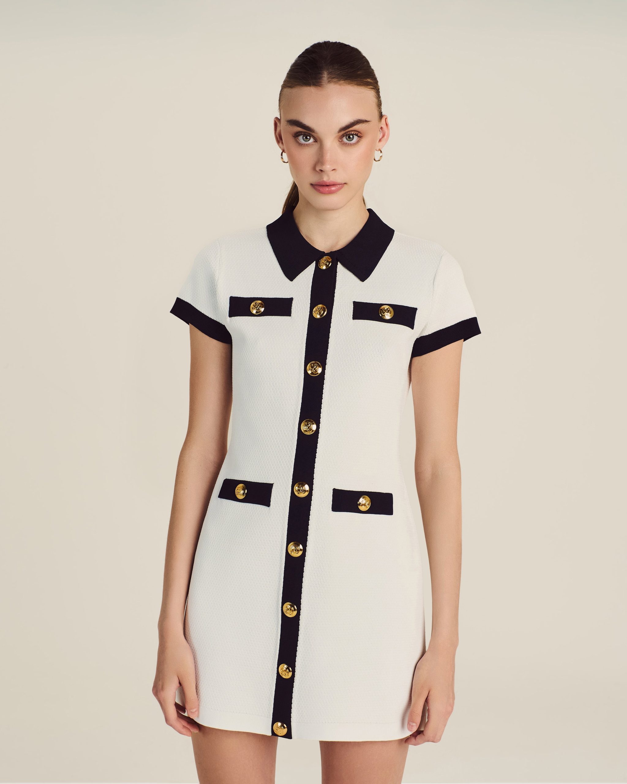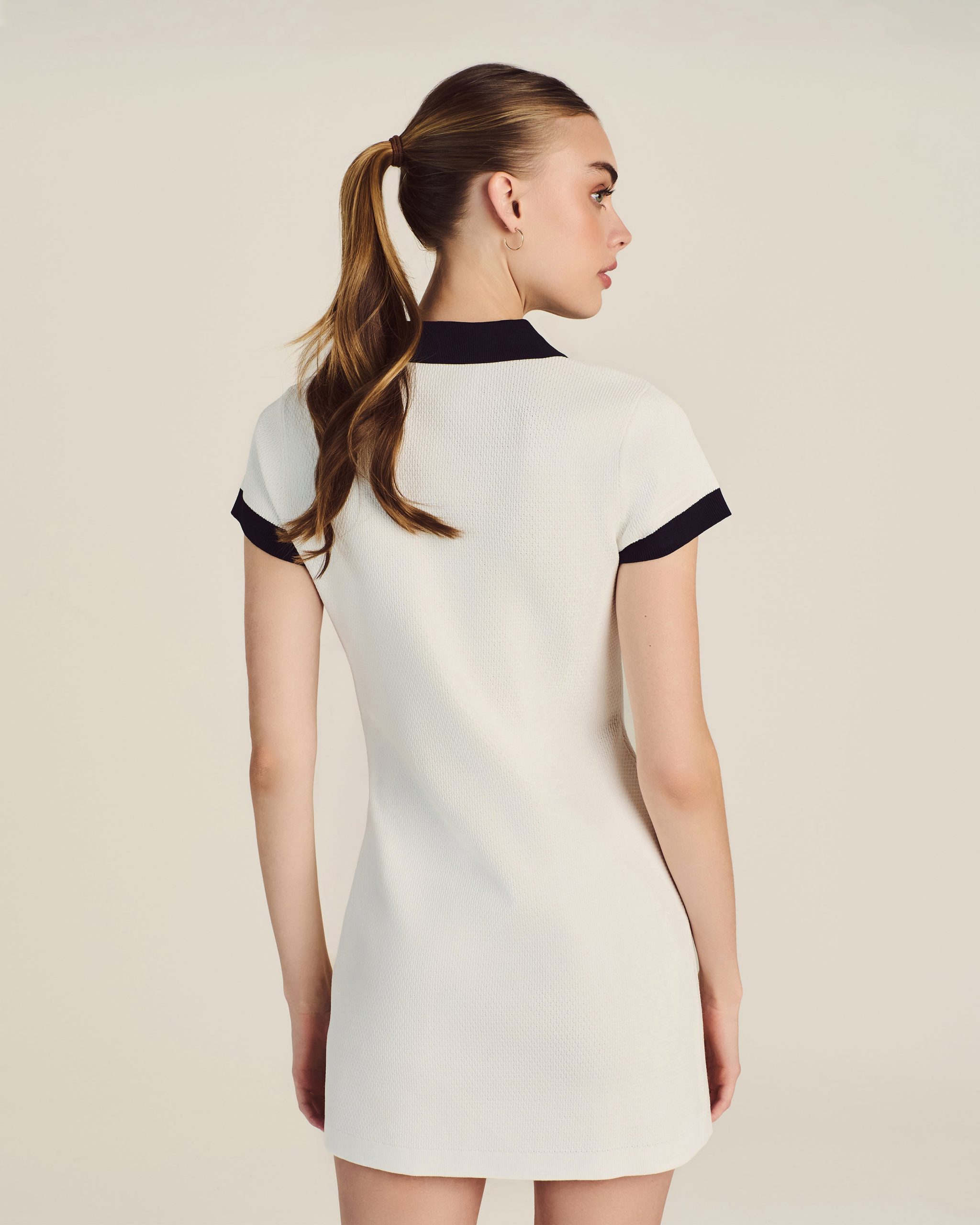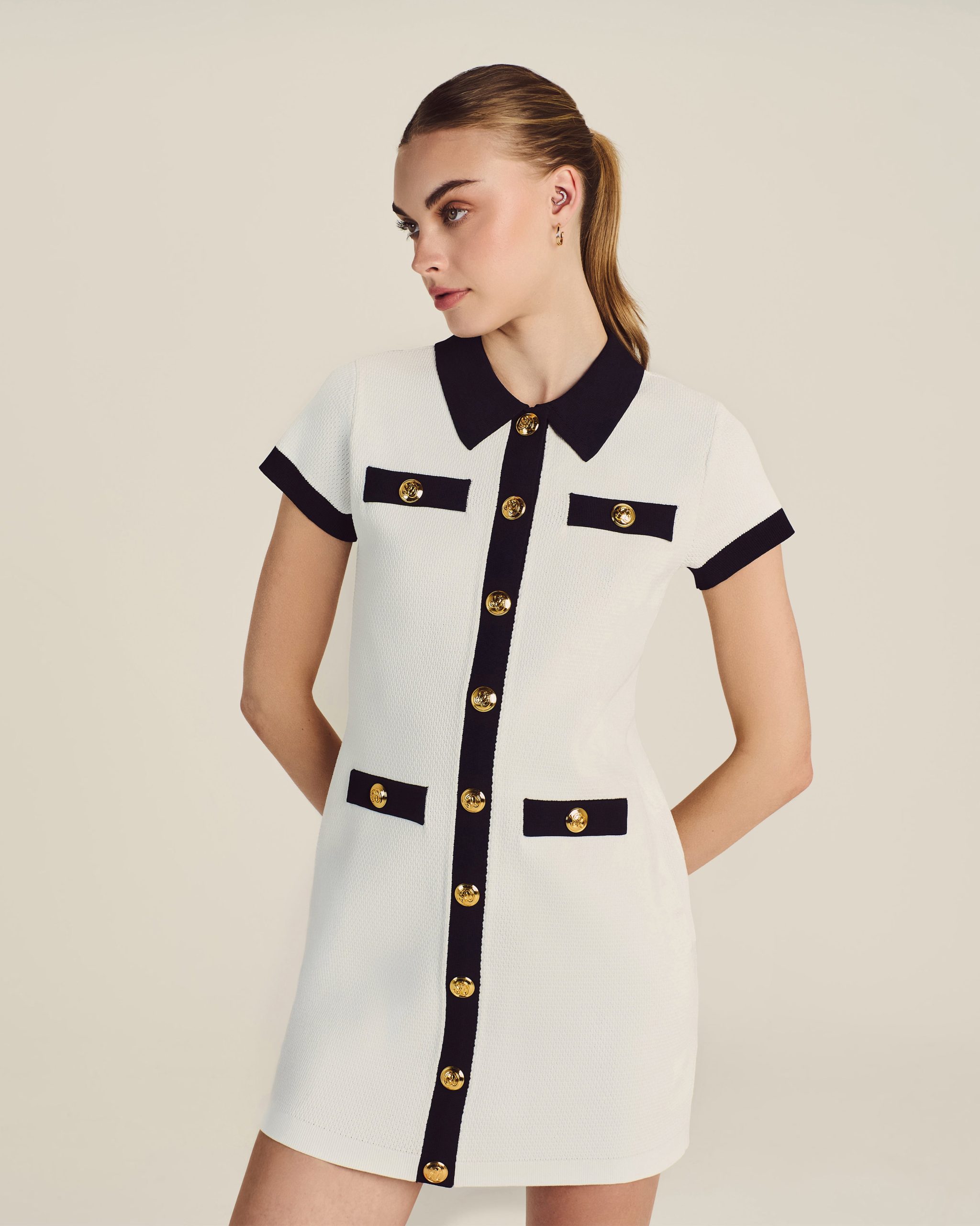 Created for the exclusive Malbon x St. John collaboration. this style reimagines the classic polo silhouette as a sleek dress to wear to the clubhouse or anywhere that calls for understated glamour. The comfortable Contrast Knit offers ease of movement while the striking Midnight trim and gold buttons embossed with Malbon’s logo add refinement that lasts long after tee time.